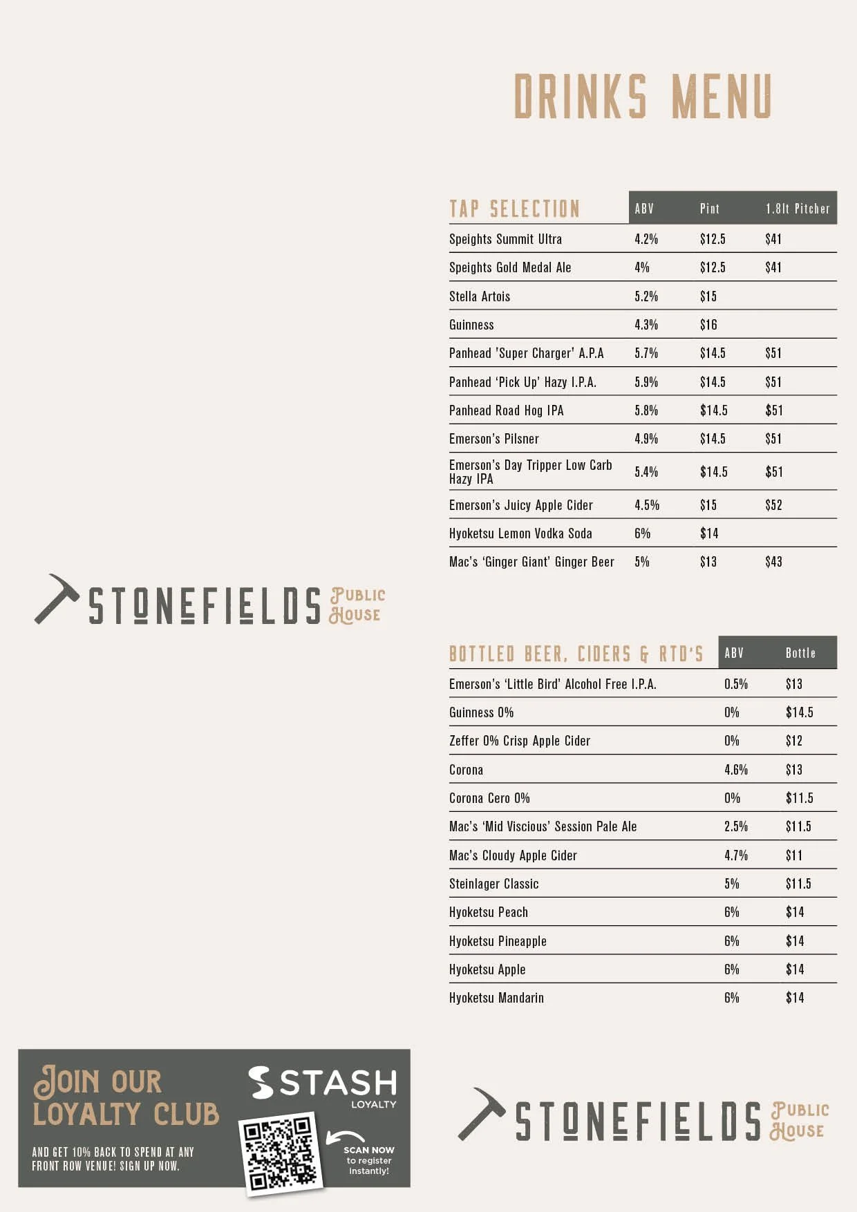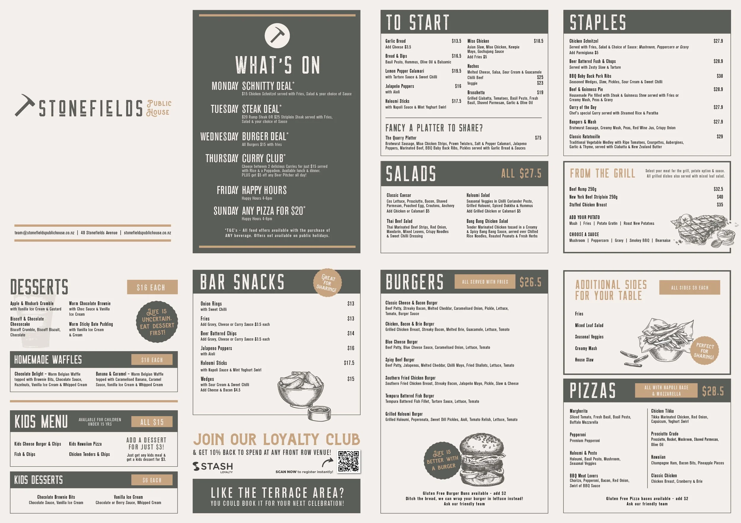 At Stonefields Public House we’re all about pub grub done well. So, you’ll see favourites like fish and chips, salads, pizzas and a range of burgers with some winter warmers added in the cooler months. We use fresh ingredients with generous portion sizes and most days have a daily special.